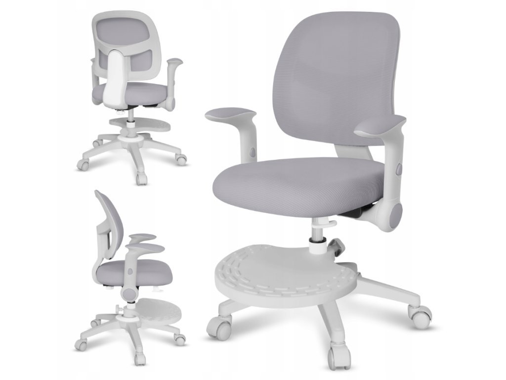 Opěrka nohou usnadňuje zaujmutí ergonomické polohy při sezení a zabraňuje únavě nohou. Nastavení nahoru a dolů umožňuje přizpůsobit otočnou židli výšce dítěte a zajistit tak stabilní oporu.