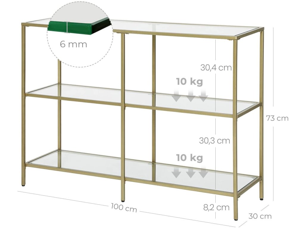 Konzola vyrobena ze skla a kovu s práškovou povrchovou úpravou. Produkt vytváří úžasnou dekoraci pro váš pokoj. Konzolové police jsou stabilní, takže na ně můžeme umístit knihy, květiny ve vázách, ozdobné figurky, dětské hračky a rámečky na fotografie. Vhodné rozměry konzole poskytují dostatek místa pro naše věci.Moderní, luxusní a zároveň jednoduchý vzhled – tyto vlastnosti vás jistě vybízejí k výběru tohoto kusu nábytku. Nábytek je univerzální a funkční, skvěle zapadne do obývacího pokoje, ložnice, předsíně či domácí pracovny.
