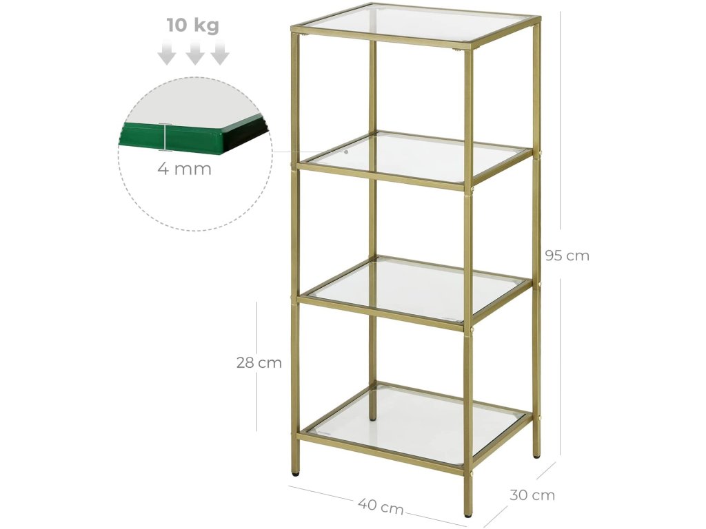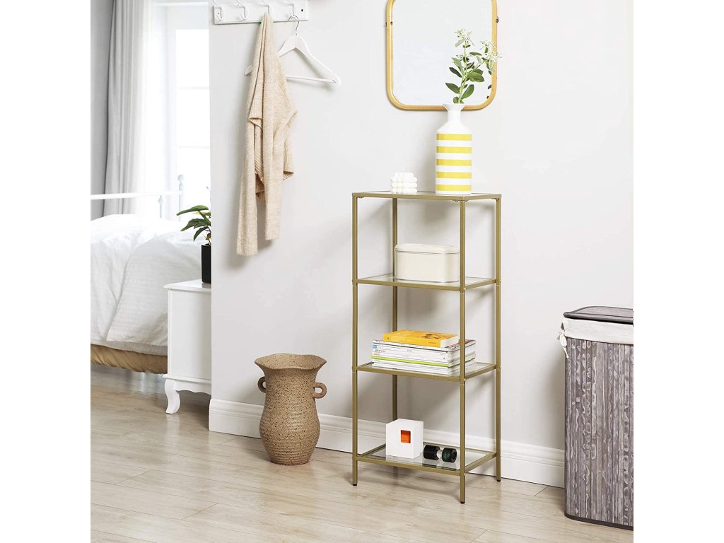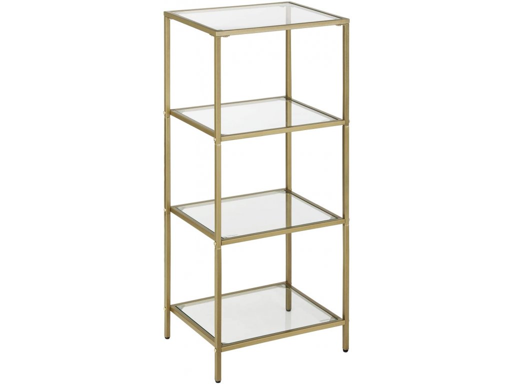 Police vyrobena ze skla a kovu s práškovou povrchovou úpravou. Produkt vytváří úžasnou dekoraci pro váš pokoj. Poličky knihovny jsou stabilní, takže na ně můžeme umístit knihy, květiny ve vázách, dekorační figurky, dětské hračky a rámečky na fotografie.Moderní, luxusní a zároveň jednoduchý vzhled police – tyto vlastnosti vás jistě vybízejí k výběru tohoto kusu nábytku. Regál je univerzální a funkční, skvěle se bude hodit do obývacího pokoje, ložnice, předsíně, domácí pracovny, kuchyně a 4 police usnadní přístup k vašim oblíbeným věcem.