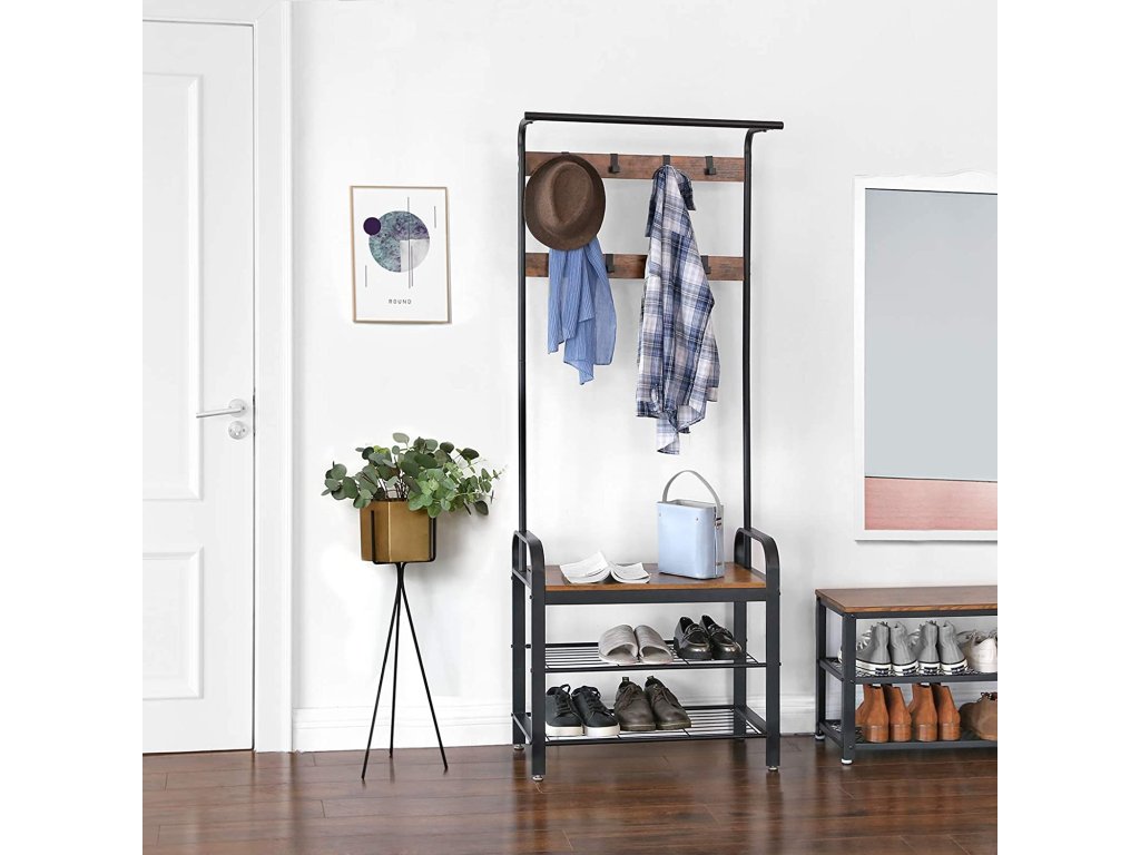 Pod věšákem se nacházejí 2 odolné a prostorné police na boty, které vám pomohou zorganizovat boty ve vaší domácnosti, a sedátko, které nám umožní efektivní obouvání.