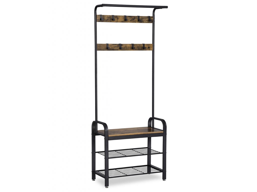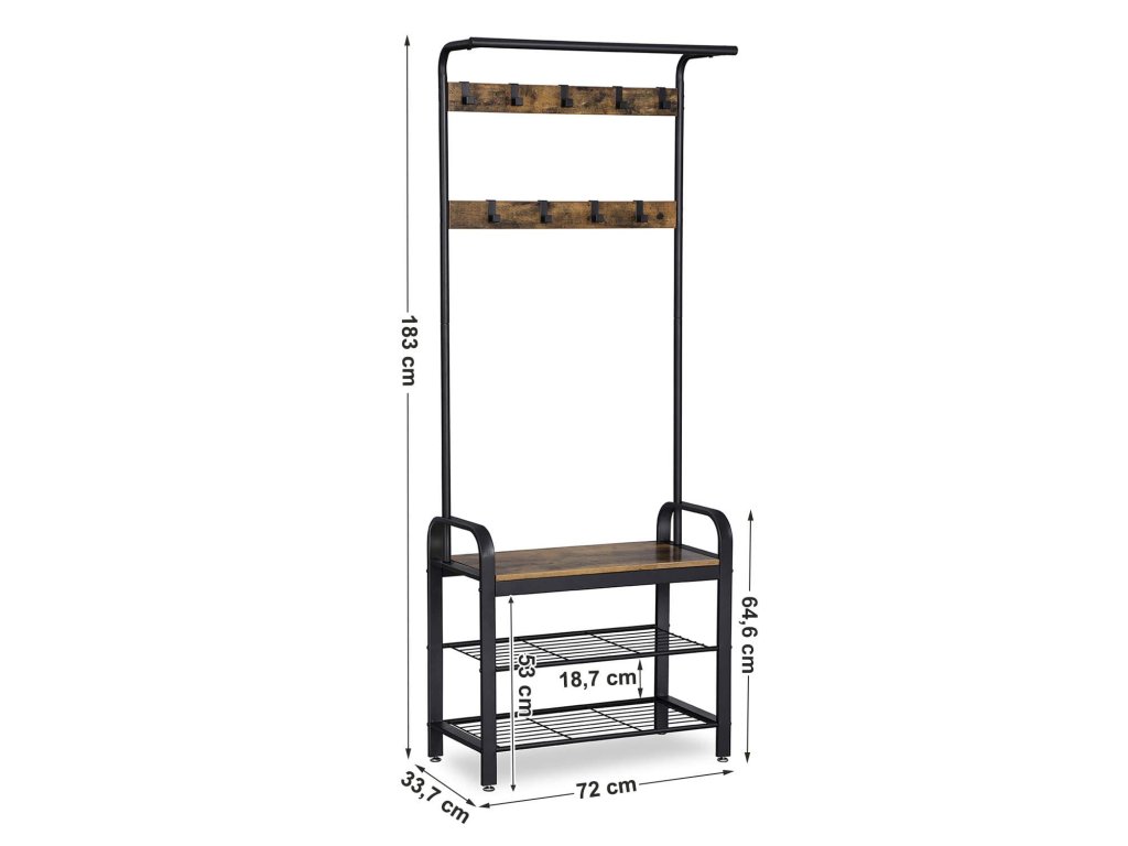 Máte už dost nepořádku v předsíni nebo na chodbě? Bundy a kabáty leží na židlích a křeslech v obývacím pokoji a jídelně místo toho, aby visely na ramínku? Pokud je odpověď ano, jste na správném místě. Představujeme věšák na šaty se sedadlem a policemi na boty, které vnesou pořádek a pořádek. Tento praktický kus nábytku uspořádá váš svrchní oděv, doplňky a další drobnosti, jako jsou klíče.Stojan má celkem 9 háků umístěných ve 2 řadách: v první řadě je 5 háčků, zatímco ve druhé řadě jsou 4. Háčky slouží k odkládání kabátů, bund, tašek, klobouků nebo klíčů. Navíc je výrobek vybaven hrazdou, na kterou můžeme zavěsit šátky, šátky nebo komínky. Hodí se zejména v zimním období, kdy jsou šátky neodmyslitelnou součástí našeho outfitu. Bundy, kabáty či šaty a košile si můžeme dát i na ramínka na berle, díky čemuž získáme další prostor pro odkládání věcí.